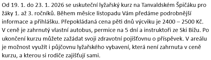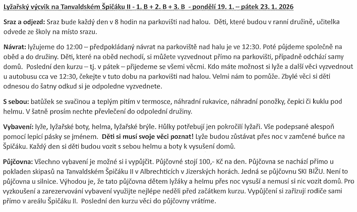 - TV-v podepsaném látkovém sáčku a vše podepsané - sportovní oblečení, sportovní obuv do tělocvičny, pro dívky nutná gumička do vlasů.